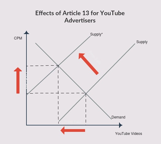 The first thing that will happen if the proposed legislation gets turned into law will be a large number of current YouTube videos getting blocked, this forces the supply line to shift to the left. As a result, the supply curve shift shows a new lower level of YouTube videos on the X-axis but also on the Y-axis the CPM has risen to a new equilibrium point (fancy way of saying when the supply and demand curve meet). This new higher level of CPM is a direct result of Article 13 and the decrease in the supply of YouTube videos.